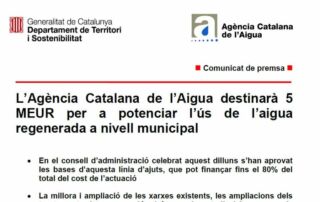 El pasado 18 de noviembre, la Agencia Catalana del Agua publicó una nota de prensa en la que anunciaba la decisión de destinar cinco millones de euros para potenciar el uso municipal de agua [...]