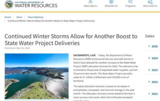 El Departamento de Recursos Hídricos (DWR) de California ha anunciado que las borrascas frías y húmedas del mes de marzo han permitido seguir aumentando la previsión de suministros de agua del State Water Project [...]
