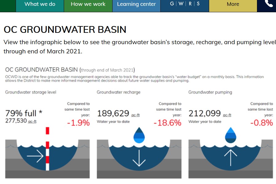La reserva de agua almacenada en el acuífero del OCWD, la magnitud de la recarga del acuífero realizada durante los últimos 12 meses y las extracciones de agua realizadas hasta finales del mes de marzo de 2021 pueden consultarse en esta infografía.
