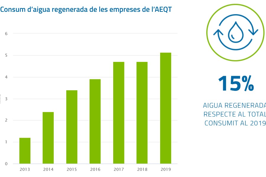 Las gráficas relativas al consumo de agua por las empresas de la AEQT entre los años 2010 y 2019 muestran unos consumos totales de 34 hm3 durante el año 2019, de los cuales 5,13 hm3 correspondieron al consumo de agua regenerada producida en la ERA de El Camp de Tarragona. Esto hace que el uso de agua regenerada represente un 15 % de toda el agua utilizada anualmente por las empresas de la AEQT.