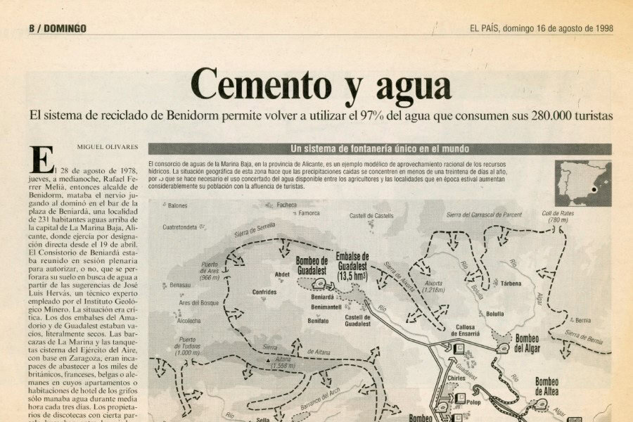 El domingo 16 de agosto de 1998, el diario El País publicó la noticia titulada “Cemento y Agua” en la presentaba “el sistema de reciclado de agua en Benidorm [...]