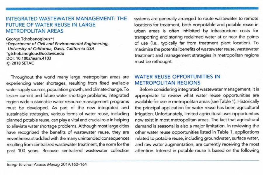 En el año 2019, la revista técnica Integrated Environmental Assessment Management publicó un artículo del Dr. George Tchobanoglous titulado “Gestión integrada del agua residual: el futuro de la reutilización [...]