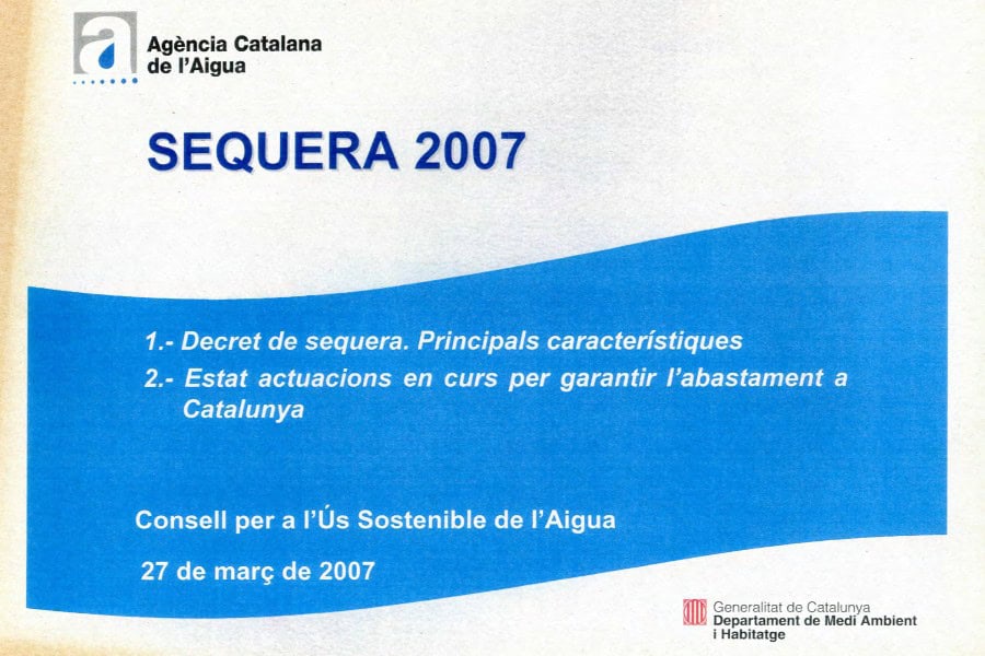 En marzo de 2007, la Agència Catalana de l’Aigua presentó ante el Consell per a l’Ús Sostenible de l’Aigua el informe titulado “Sequera 2007” en el que se describían: [...]