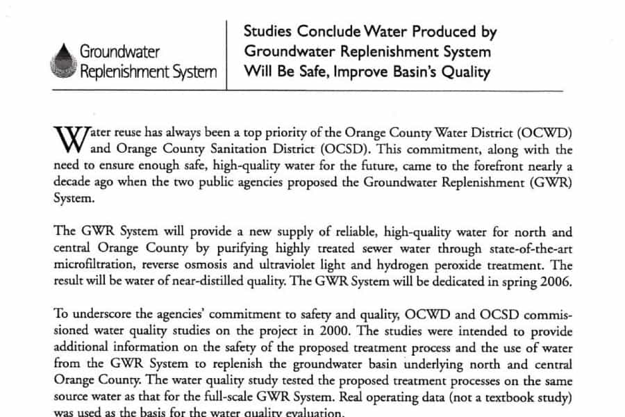 El folleto divulgativo titulado "Studies conclude water produced by GWRS will be safe, improve basin's quality", publicado por el OCWD en 2002 para anunciar los resultados favorables documentados en [...]