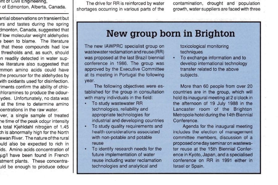 El artículo titulado "Wastewater reuse cuts down waste", publicado en el Magazine Water Quality International en su número 2, del año 1988, anuncia la creación del "nuevo grupo especializado [...]