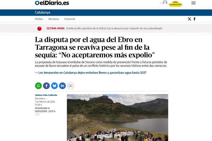 El portal de ElDiario.es publicó el domingo 1 de febrero un excelente artículo de Helena Sala titulado “La disputa por el agua del Ebro en Tarragona se reaviva pese [...]