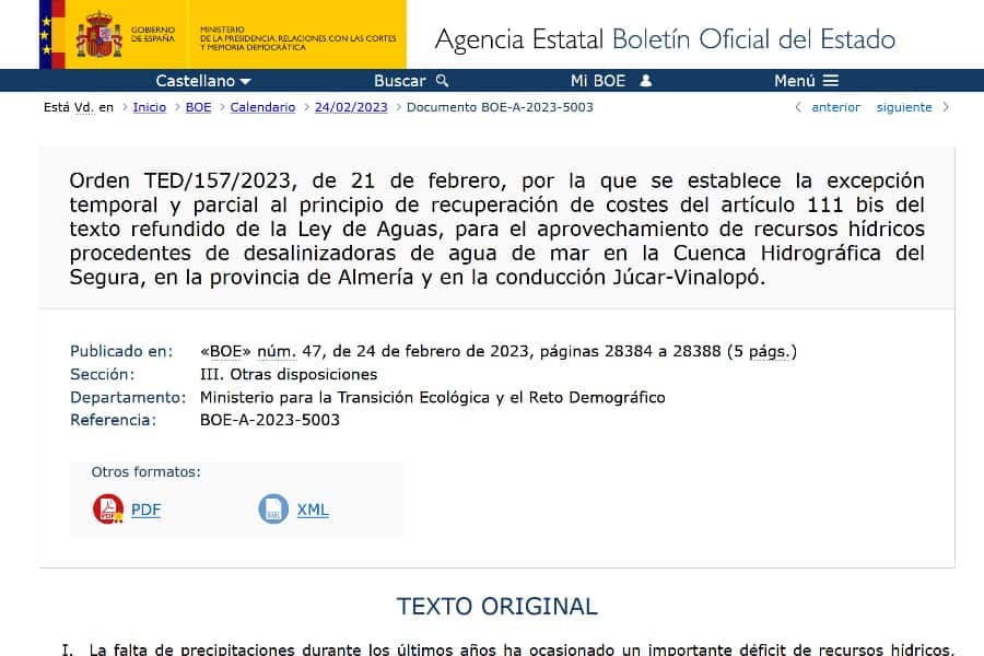 Aprovechamiento agrícola de agua desalinizada: TED/157/2023