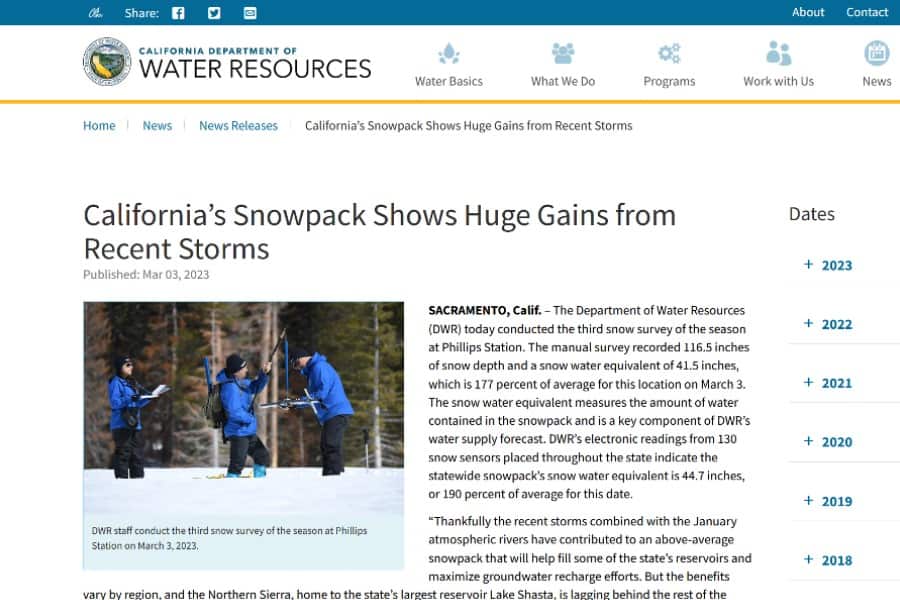 El pasado 3 de marzo, el portal del Departamento de Recursos Hídricos de California publicó los resultados del tercer muestreo de espesor de nieve de la estación húmeda, en [...]
