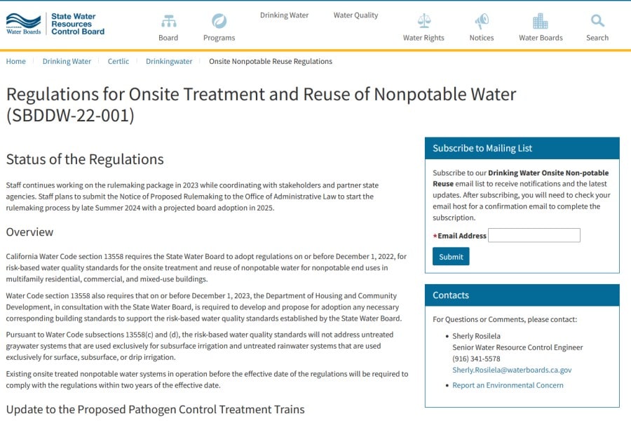 El portal de Consejo Regulador del Agua del Estado de California informa, en su página titulada “Normativas para el tratamiento y reutilización in situ de agua no notable (SBDDW-22-001)”, [...]