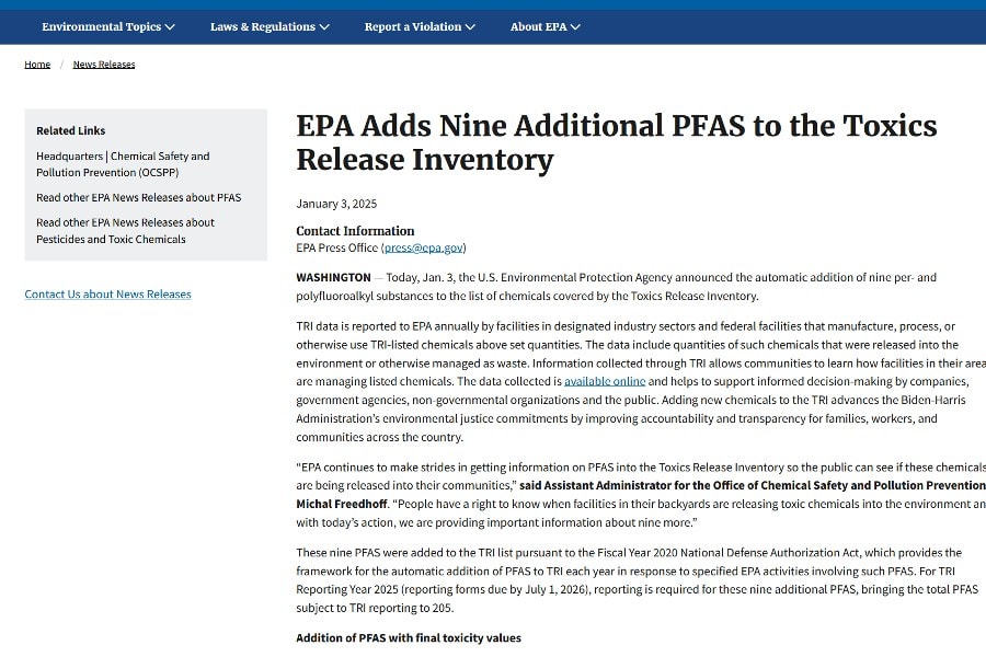 Nueve PFAS adicionales en el inventario de tóxicos de la USEPA