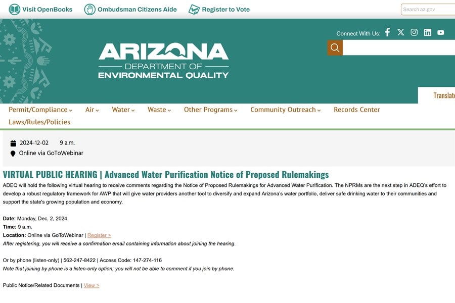 El Departamento de Calidad Ambiental de Arizona (ADEQ) ha publicado una propuesta de normas para la purificación avanzada de agua, que incluye la celebración de una reunión informativa virtual [...]