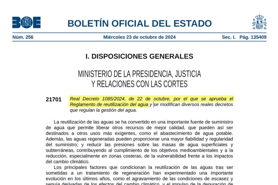 El Real Decreto 1085/2024, de 22 de octubre, por el que se aprueba el Reglamento de reutilización del agua y se modifican diversos reales decretos que regulan la gestión [...]
