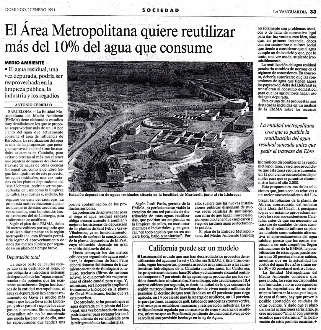 El domingo 27 de enero de 1991, el diario La Vanguardia incluyó en su sección de Sociedad una noticia cuyo titular «El Área Metropolitana quiere reutilizar más del 10 % del agua que consume» reflejaba el interés del momento por explorar la posiblidad de que «El agua residual, una vez depurada, podría ser reaprovechada en la limpiza púbica, la industria y los regadíos» y resaltaba el interés de que «La entidad metropolitana cree que es posible la reutilización del agua residual saneada antes que pedir el trasvase del Ebro«.